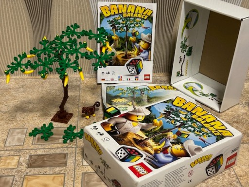Oryginalny zestaw Lego Banana Balance, numer 3853. Kompletny zestaw, oprócz jednego banana - jest 11 szt winno być 12 szt po za tym wszystkie elementy, instrukcja i broszura. Pudełko ma małe ślady użytkowania Wyprodukowano w 2011 roku i jest obecnie wycofane ze sprzedaży. Świetny przedmiot kolekcjonerski. Wspaniały dodatek do kolekcji.