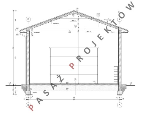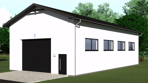 Na frontowej ścianie umieszczono szeroką bramę o wymiarach 450x400 cm oraz drzwi wejściowe do budynku.