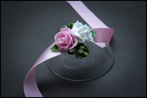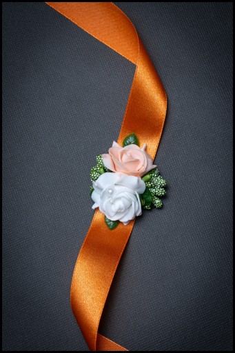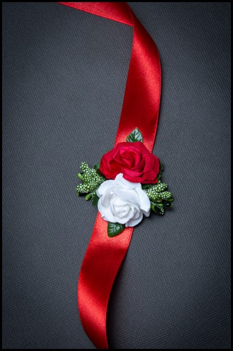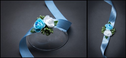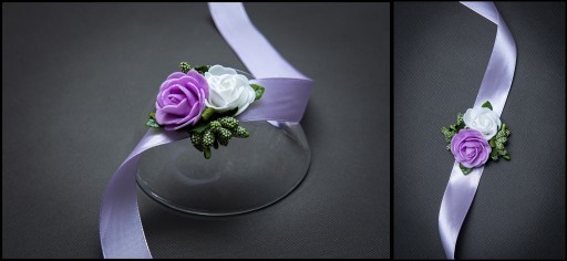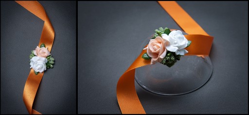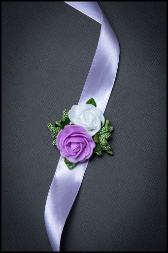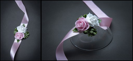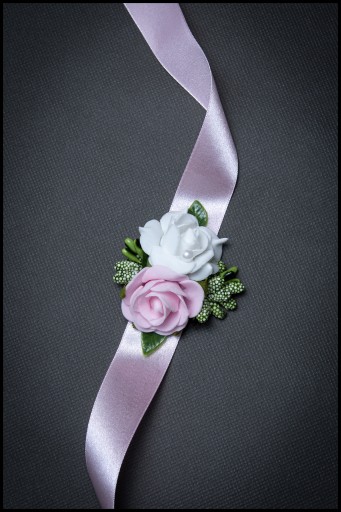 Bukieciki wykonane na efektownej szerokiej wstążce do zawiązania na rękę.