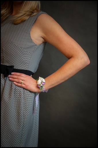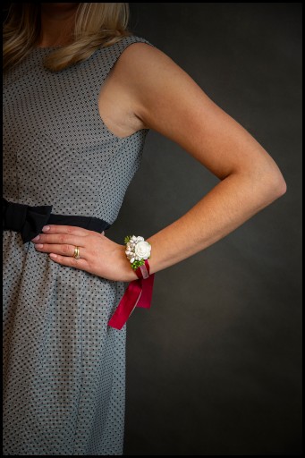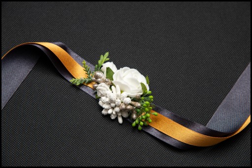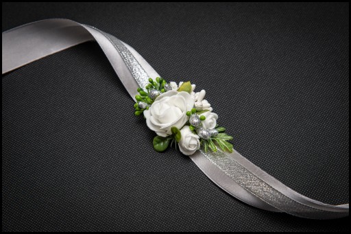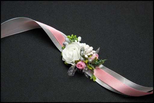 Bukieciki posiadają ozdobną podwójną wstążkę do zawiązania na rękę.
