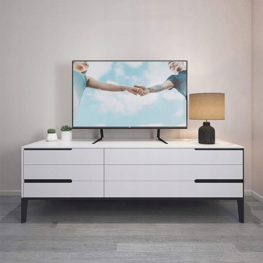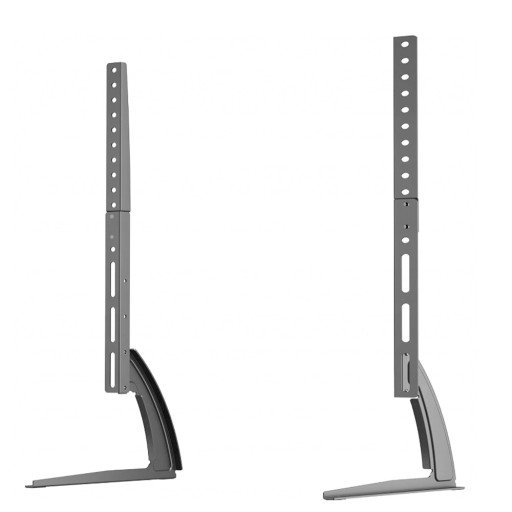 Przestrzeń między dwiema nogami zapewnia idealne miejsce na sprzęt audio lub akcesoria, dzięki czemu system rozrywki jest schludny i uporządkowany. Solidna stalowa konstrukcja z systemem dwóch nóg zapewnia wysoką stabilność i trwałość; dolne podkładki zapobiegają zarysowaniu powierzchni.