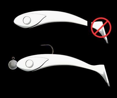 UNIKALNY KSZTAŁT KORPUSU SPRAWIA, ŻE PRZYNĘTA PORUSZA SIĘ W KSZTAŁT LITERY "S", ABY TAK BYŁO, PODCZAS KLASYCZNEGO ZBROJENIA GŁÓWKĄ JIGOWĄ, NALEŻY DOSTOSOWAC WIELKOŚĆ HAKA, ABY KOLANKO WYCHODZIŁO GRZBIETEM NA WYSOKOŚCI LITER "S" LUB "E".