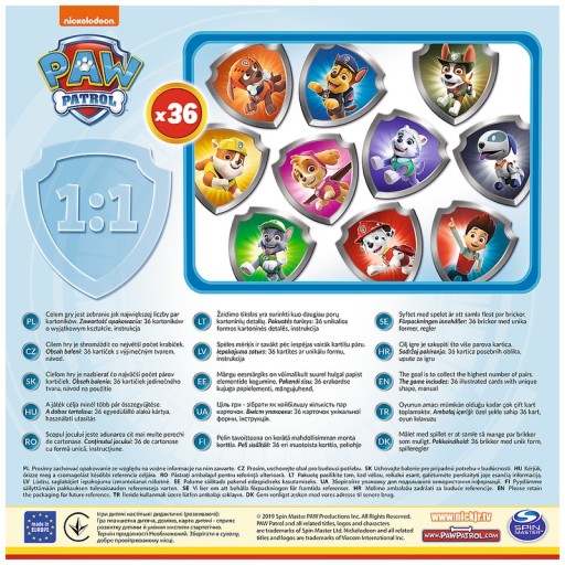 • 36 kartoników w kształcie odznak policyjnych z wizerunkami postaci z Psiego Patrolu,