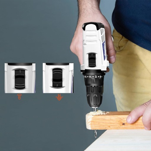 - Przyciski do przodu i do tyłu są łatwe w obsłudze i umożliwiają wiertarce szybkie przełączanie pomiędzy wierceniem i wykręcaniem wkrętów.