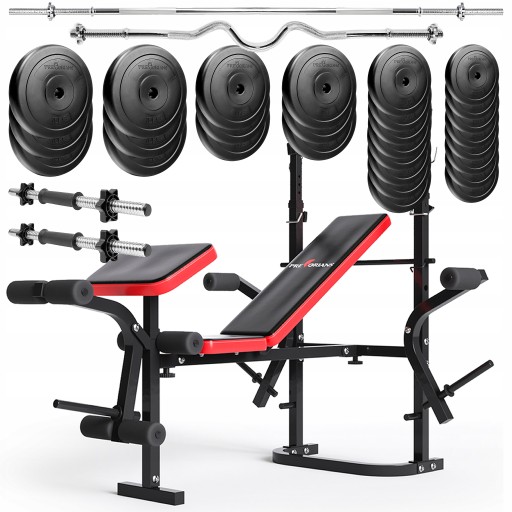 ✔️ Ten zestaw zawiera ławkę regulowaną, gryf prosty, gryf mocno łamany, krótkie gryfy do hantli oraz obciążenia o łącznej wadze 120 kg, co pozwala na skuteczny trening całego ciała.