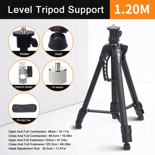 5. SPECYFIKACJA GWINTU: Statyw z poziomicą wyposażony w adapter 1/4, uniwersalne złącze gwintowane, odpowiedni do wszystkich poziomic, użyteczny i praktyczny, bardzo pomaga