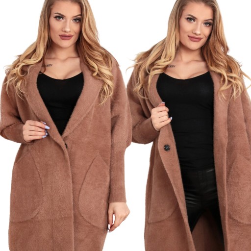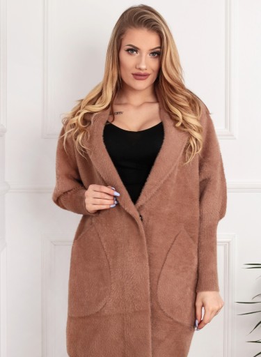 PŁASZCZ KURTKA DŁUGI SWETER NARZUTKA ALPAKA CIEPŁA CIEMNY KARMELOWY 1943