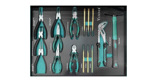 - Wkładki i Narzędzia: Sześć szuflad jest wyposażonych w wkładki i ręczne narzędzia wykonane z wytrzymałej stali CrV.