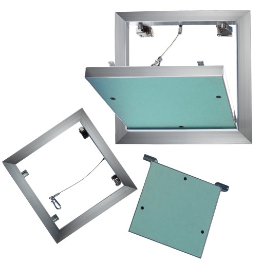 ✅ Klapa rewizyjna wykonana z aluminium i wodoodpornej płyty karton-gips, wyposażona w dwa zamki zapadkowe.