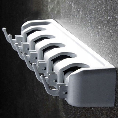 - 5 AUTOMATYCZNYCH UCHWYTÓW – wieszak posiada 5 uchwytów, które dostosowują się do grubości trzonka. Każdy uchwyt z jednej strony ma kulkę samozaciskową, a z drugiej wyposażony jest w gumę ze stoperem.