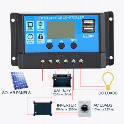 . REGULATOR ŁADOWANIA 12V 24V KONTROLER SOLARNY 30A LCD 2xUSB PWM