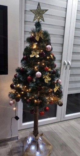 Zdjęcia prezentują przykładowe dekoracje z choinką na pniu. To rzeczywisty wygląd oferowanego przez nas drzewka.