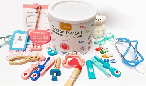 Zestaw zabawek dla lekarzy zawiera wystarczającą ilość medycznych, aby dziecko mogło odegrać rolę lekarza, pielęgniarki, dentysty lub pacjenta.