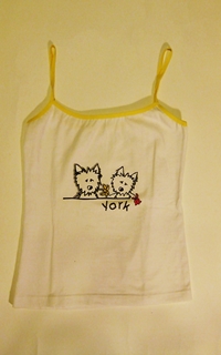 Podkoszulka jest biała, z motywem piesków na przodzie, krój dopasowany.