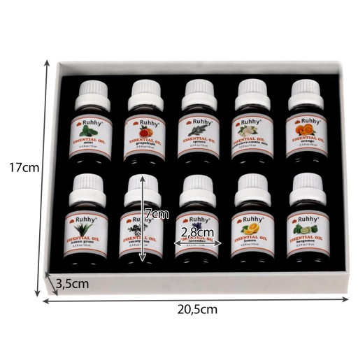 - 10 RÓŻNYCH ZAPACHÓW – cały zestaw posiada 10 rożnych zapachów takich jak: eukaliptusowy, pomarańczowy, miętowy, lawendowy, sosnowy, cytrynowy, lilia wodna, grejpfrutowy, trawa cytrynowa, bergamotkowy. Wszystkie olejki są zapieczętowane w buteleczkach o pojemności 15 ml każdy.