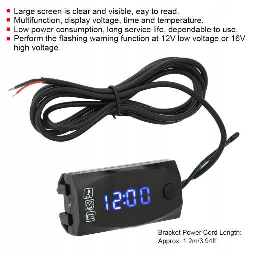 1. Wielofunkcyjny wskaźnik, cyfrowy wyświetlacz 3 w 1, wyświetla napięcie, czas i temperaturę.