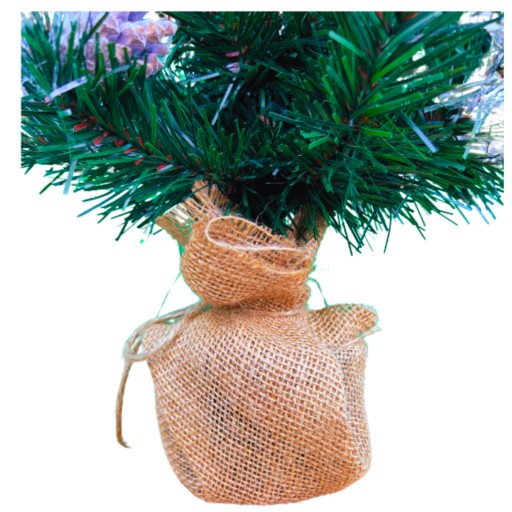 Solidna podstawa: Choinka jest stabilnie osadzona w stylowym, jutowym woreczku, który doskonale komponuje się z jej naturalnym wyglądem.