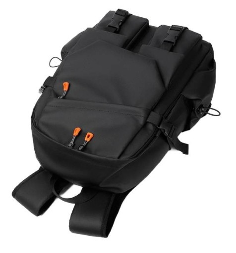 ✔️ Plecak posiada jedną komorę główną oraz cztery mniejsze kieszonki, które zamykane są na zamki błyskawiczne lub klamry, we wnętrzu większej komory znajduję się jedna otwarta kieszonka z miejscem na laptopa,