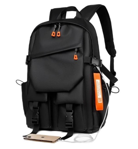 ✔️ Zewnętrzny port USB na boku plecaka z wbudowanym kablem ładującym przy pomocy którego wygodnie podłączysz powerbank i naładujesz swój tablet czy telefon,