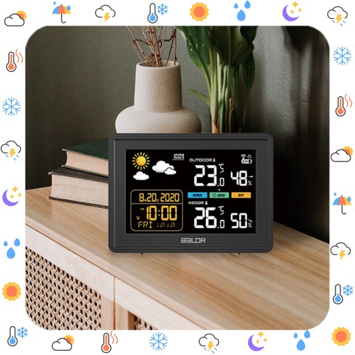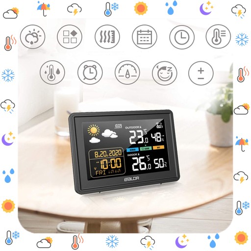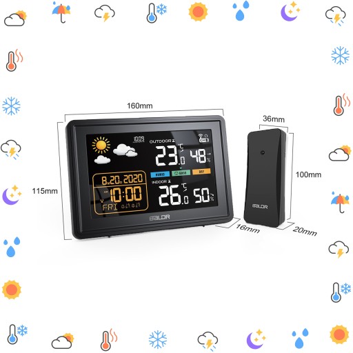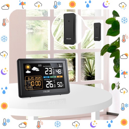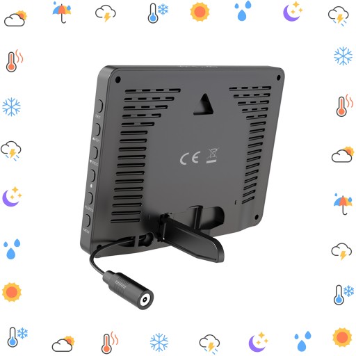 - Kalendarz, Zegar i Budzik: Stacja pogodowa pełni również funkcję kalendarza i zegara z możliwością ustawienia alarmu i funkcji drzemki.