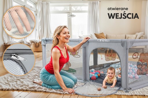 - Kojec wyposażono w dwa boczne wejścia zapinane od zewnątrz, co zapobiega samodzielnemu otwarciu przez dziecko. Jest to wygodne rozwiązanie dla opiekunów, eliminujące potrzebę częstego podnoszenia malucha ponad ściankami, co chroni plecy dorosłych.