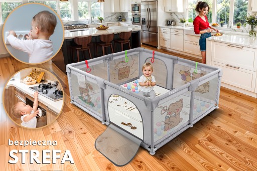 Kojec dziecięcy duży 150x180 cm z edukacyjną matą piankową, czterema uchwytami dla dzieci i 50 kolorowymi piłeczkami do zabawy! Przeznaczony dla dzieci od pierwszych dni życia.