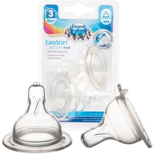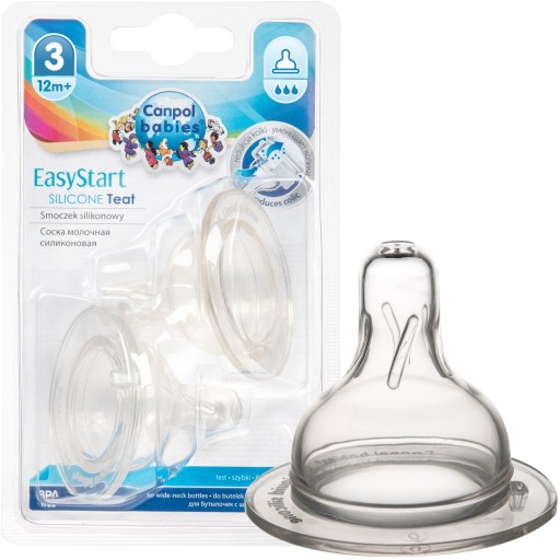 Antykolkowy smoczek szybki do butelek szerokich EasyStart przypomina kształtem pierś mamy, dzięki czemu umożliwia łączenie karmienia naturalnego z karmieniem butelką. Smoczek doskonale się odpowietrza, redukując ryzyko wystąpienia kolki. Wykonany został z wysokiej jakości silikonu. Przystosowany jest do wielokrotnej dezynfekcji. Przeznaczony dla dzieci w wieku 12m+.