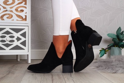 Eleganckie botki damskie z zamszu na słupku w kolorze czarnym. 💥 Łatwe w zakładaniu- zapinane na suwak.😍 Wykonane z dobrych jakościowo materiałów. Idealne na wiosnę lub jesień 🍂 Szeroki obcas zapewnia stabilność oraz komfort użytkowania. Modny fason z najnowszej kolekcji 2024 stanie się uzupełnieniem niejednej stylizacji, a stylowe wycięcie doda im szyku.👍