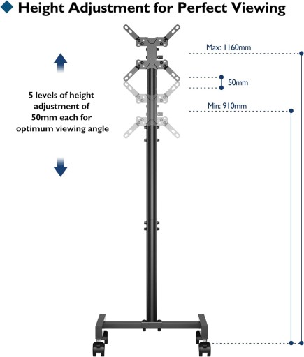 Regulowana wysokość: Aby uzyskać idealny kąt widzenia, podstawka pod telewizor ma 5 poziomów wysokości od 910 mm do 1160 mm, z których każdy różni się o 50 mm. Ponadto podstawkę pod telewizor można również odchylić o 30 stopni, zapewniając różne kąty widzenia.