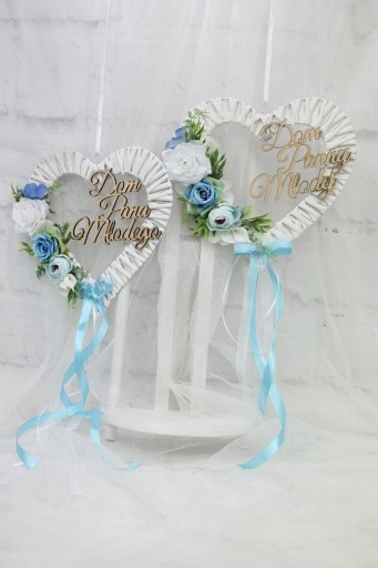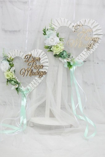 Dodatkowo ozdobione drewnianym napisem Dom Pana Młodego oraz Dom Panny Młodej.