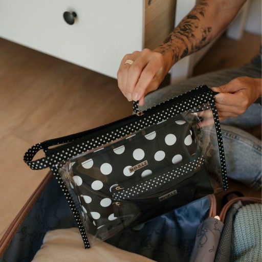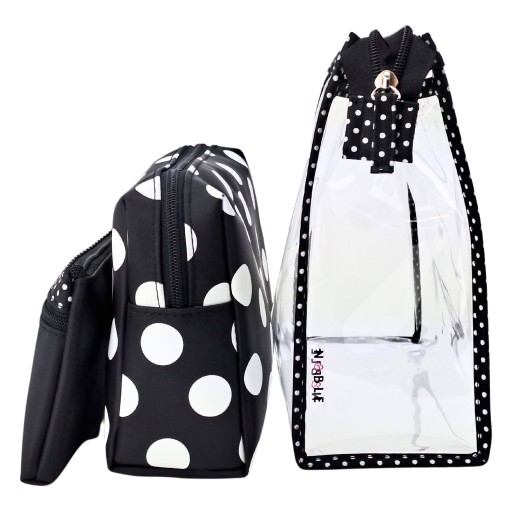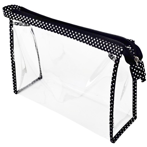 Przezroczysta kosmetyczka idealna na podróż samolotem, siłownię lub basen, zapewnia pełną widoczność zawartości, co ułatwia szybkie znalezienie potrzebnych rzeczy. Jej duży rozmiar pozwala na przechowywanie zarówno kosmetyków, jak i innych akcesoriów, a także zmieści mniejsze kosmetyczki z zestawu. Wykonana z grubego, sztywnego materiału, który gwarantuje trwałość i odporność na uszkodzenia. Kosmetyczka posiada elegancką czarną oprawę ozdobioną białymi kropkami oraz solidny zamek błyskawiczny, który zapewnia wygodne i bezpieczne zamykanie. Niezbędny dodatek dla osób ceniących wygodę i funkcjonalność.