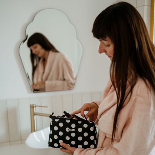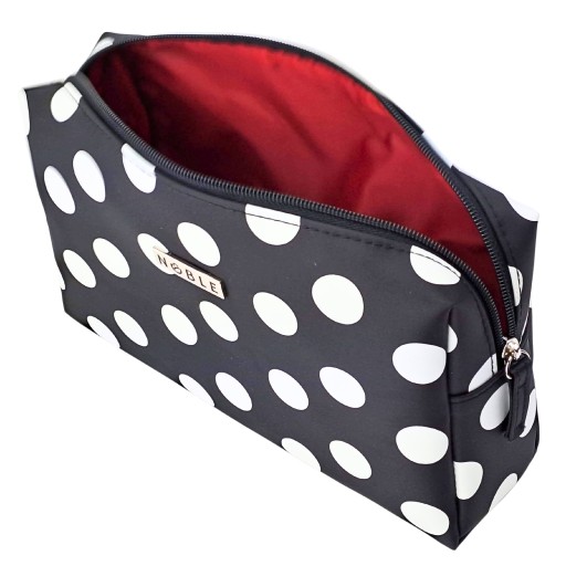 Średniej wielkości kosmetyczka w eleganckim czarnym kolorze, ozdobiona dużymi białymi kropami, to stylowy i praktyczny dodatek do Twojej kolekcji. Wewnątrz znajduje się intensywnie czerwona podszewka, która dodaje jej charakteru i ułatwia znalezienie drobnych przedmiotów. Organizer jest idealny do przechowywania kosmetyków oraz innych niezbędnych akcesoriów, zapewniając porządek w Twojej torebce lub walizce. Dzięki solidnemu wykonaniu i trwałym materiałom, kosmetyczka sprawdzi się zarówno na co dzień, jak i w podróży.