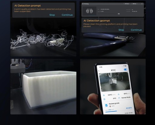K1 może drukować z dysku USB lub Wi-Fi. Jeśli istnieje połączenie sieciowe, drukarka FDM może być zdalnie sterowana i monitorowana za pomocą aplikacji/aplikacji internetowej Creality Print lub Creality Cloud. Sterowanie klastrem jest również możliwe, jeśli kilka drukarek K1 jest online. Pamiętaj, że do zdalnego monitorowania potrzebujesz (opcjonalnej) kamery AI.