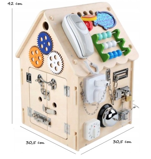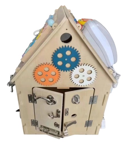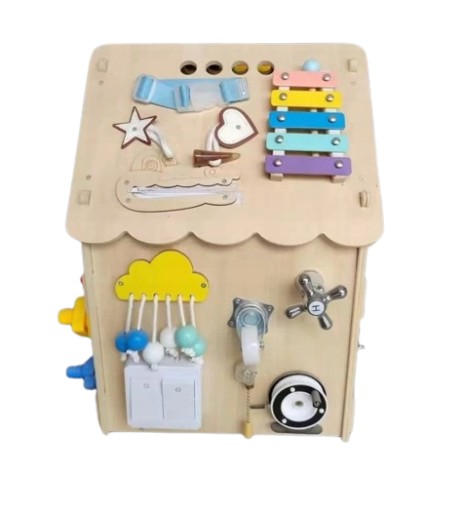 Drewniany domek manipulacyjny to zabawka stymulująca zmysły i małą motorykę u dzieci.