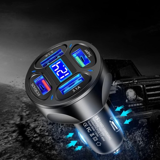 Ładowarka posiada cztery gniazda USB, w tym jedno do super szybkiego ładowania, co umożliwia jednoczesne ładowanie wielu urządzeń.
