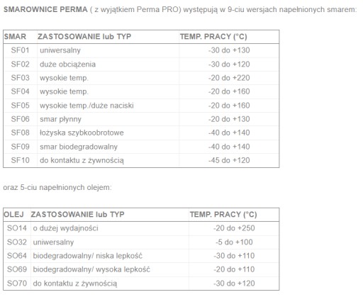 - zakres stosowania od -20°C do +60°C (bezpośrednio w punkcie smarnym)