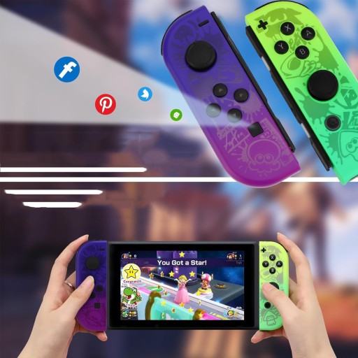 - Jako zamiennik kontrolera Nintendo Switch, kontroler wyposażony jest w 6-osiowy żyroskop somatosensoryczny i funkcję wibracji z dwoma silnikami, aby zapewnić prawdziwe i stymulowane wrażenia z gry. Udostępnij swoją grę znajomym, korzystając z funkcji zrzutów ekranu. Gdy konsola znajduje się w trybie uśpienia, naciśnij i przytrzymaj przycisk Home na kontrolerach, aby wybudzić się przez 1 s–2 s.