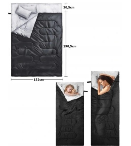 Śpiwór ma wymiary 220cm x 150cm dzięki czemu mieszą się w nim 2 dorosłe osoby. W zestawie znajdują się również 2 poduszki co jeszcze bardziej zwiększa komfort.