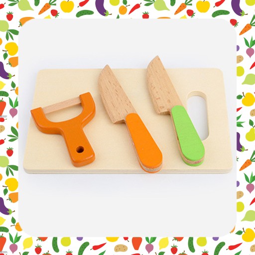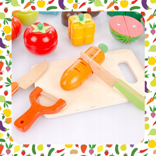 Zestaw drewnianych owoców, warzyw i ryby został zaprojektowany tak, aby dziecko mogło bezpiecznie i realistycznie naśladować krojenie prawdziwych produktów spożywczych. Każdy element, taki jak owoce, warzywa czy ryba, składa się z kilku części połączonych magnesami. Dzięki temu dziecko może łatwo „przekroić” je za pomocą dołączonych do zestawu drewnianych nożyków.