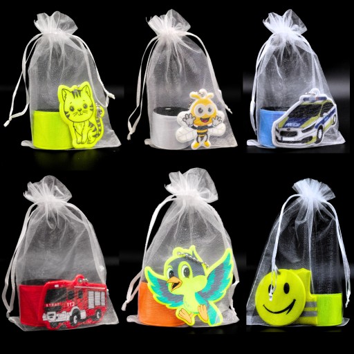 Usługa "zapakuj na prezent" obejmuje eleganckie pakowanie zestawów odblasków lub breloków do ozdobnych torebeczek wykonanych z organzy. Woreczki są białe i lekko przezroczyste.