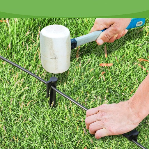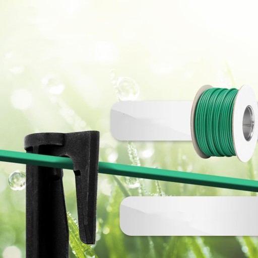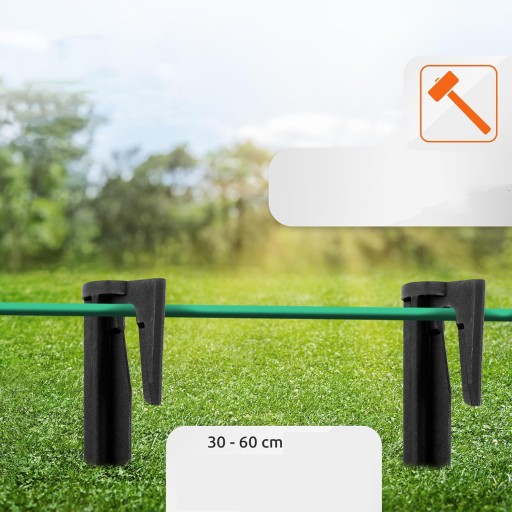 🌱 ŁATWE MOCOWANIE: Przewód ograniczający wystarczy tylko zaczepić o haczykowatą główkę kolca uziemiającego. Główka jest tak ukształtowana, że drut nie może się wysunąć.