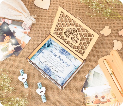 ➡️ Oprócz swojej funkcjonalności, pudełko to wprowadza do wnętrza wyjątkowy, ciepły akcent, który idealnie wkomponuje się w domową przestrzeń. Wykonane z dbałością o każdy detal, stanie się nie tylko praktycznym schowkiem, ale także ozdobą, która będzie cieszyć oko przez lata. Taki prezent z pewnością wyróżni się na tle innych, a Młoda Para doceni jego unikalność i osobisty charakter, który sprawi, że zawsze będzie im przypominał o ofiarodawcach oraz ich wielkim dniu.