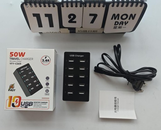 - Przenośna ładowarka USB, 10 portów, całkowita moc 50 W (i umożliwia ładowanie przy 10 amperach na 10 portach lub 2,4 ampera na port), może ładować wiele urządzeń jednocześnie.