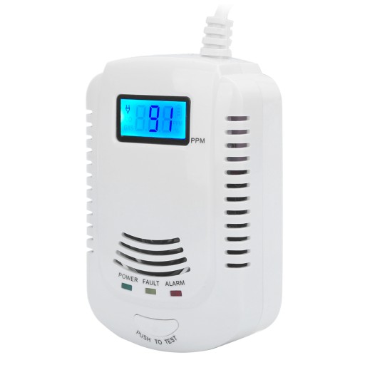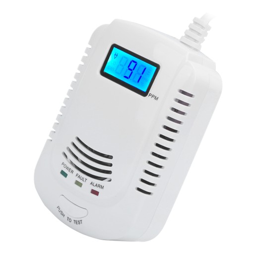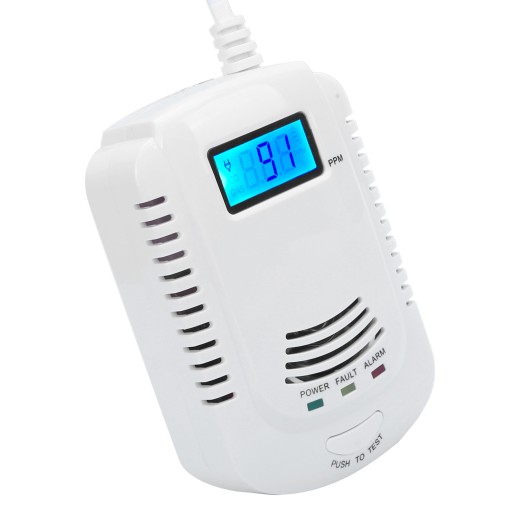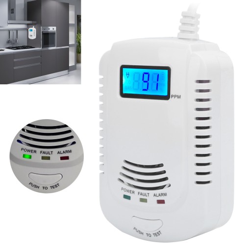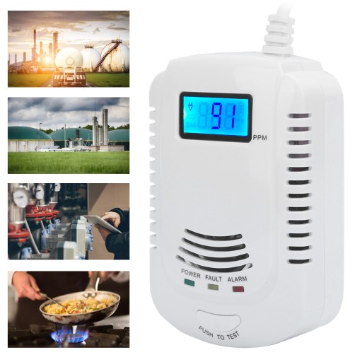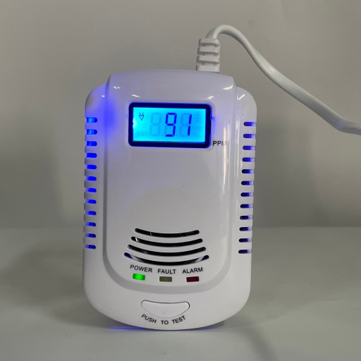 Instrukcja obsługi: urządzenie można zasilać poprzez podłączenie do zasilacza o napięciu 90-240V lub 2 szt. akumulatorów 9V. Po włączeniu urządzenia, gdy urządzenie wykryje wyciek łatwopalnego gazu, na wyświetlaczu pojawi się stężenie, głośnik włączy alarm, a wskaźnik zaświeci się na czerwono.