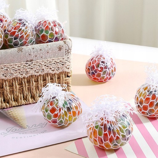 Kulka umieszczona w białej siateczce z niewielkimi oczkami, która sprawia że gniotek w momencie ściskania przybiera kształt kiści winogrona, co daje bardzo ciekawy efekt wizualny.