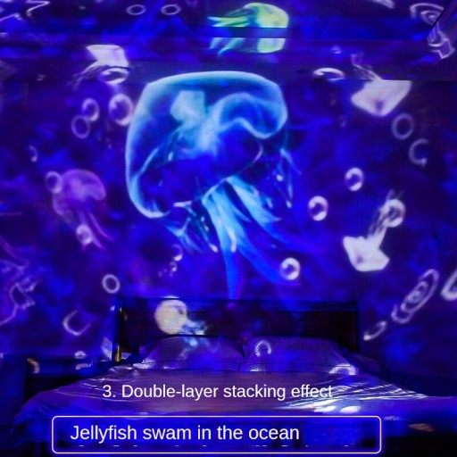 Voltage: DC5V 1A Maximum power: 4W Shell material: ABS PC Function mode: ocean water pattern and film projection can be freely switched, the light can be adjusted, and can be set to 1 hour timer shutdown, remove the projection film, cover the lid can be used as a night light, and can adjust the color of the light Ocean starry sky projection night light use scene: Can be used as a starry sky projection ambient effect light and create a jellyfish, dolphin, clown fish, starry sky, fairy deer