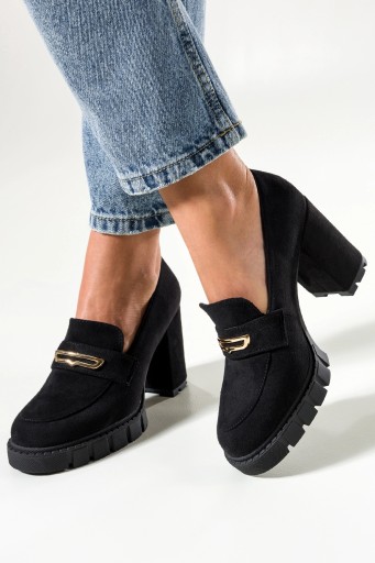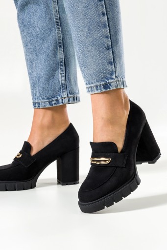 CZARNE MOKASYNY DAMSKIE PÓŁBUTY NA SŁUPKU ZE ZŁOTĄ OZDOBĄ MODNE r 39