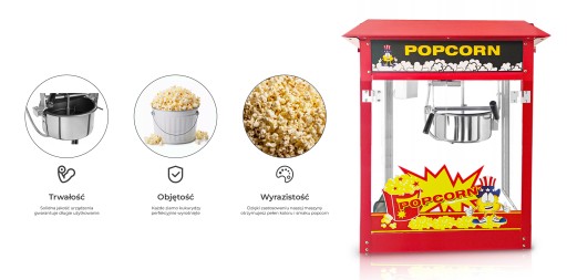 - Maszyna do popcornu oferuje wysoką jakość wykonania z trwałych materiałów zapewniających długie użytkowanie.