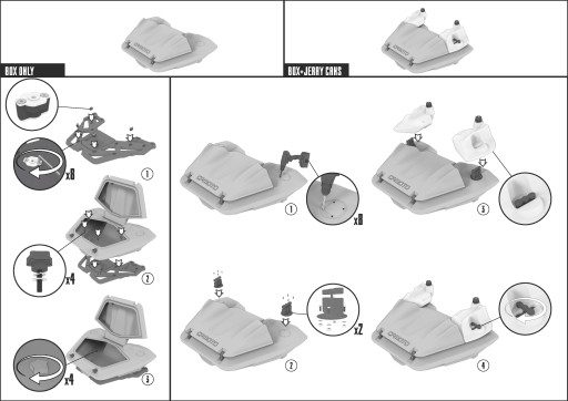 Do tego modelu można zamontować 2 kanistry o pojemności 5,8 litra (d o kupienia osobno), które są dopasowane do kształtu pokrywy, co z kolei zapewnia ciasne dopasowanie dwóch przedmiotów. Na 1 kufrze można ustawić do 2 kanistrów.