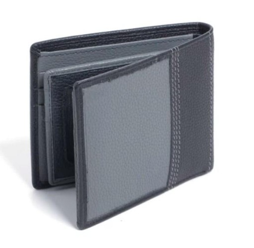 Składany portfel z prawdziwej skóry z przegródkami na karty, banknoty i monety oraz wyjątkowo płaską kieszenią.